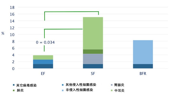 注:MFGM實(shí)驗(yàn)配方(EF)、標(biāo)準(zhǔn)配方(SF)和母乳對照(BFR)等3組嬰兒6月齡中感染發(fā)生的比較。證明MFGM可有效提高嬰兒免疫力,抵抗病菌感染。