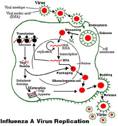 當(dāng)流感病毒入侵人體時(shí),血凝素(HA)經(jīng)由細(xì)胞膜融合進(jìn)入宿主細(xì)胞。神經(jīng)氨酸酶(NA)從感染的細(xì)胞內(nèi)被釋放出來,協(xié)助流感病毒進(jìn)入細(xì)胞復(fù)制并向外擴(kuò)散。