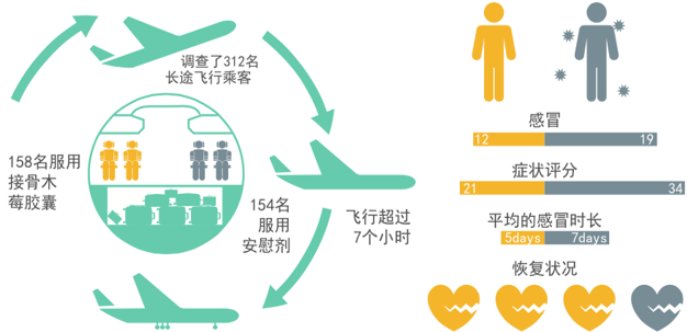 60名流感患者,隨機(jī)分成接骨木莓組和安慰劑組,15ml/次接骨木莓糖漿或安慰劑,一天4次,服用5天。接骨木莓組的疼痛,咳嗽,鼻塞充血,呼吸道粘液,睡眠質(zhì)量及總體評(píng)價(jià)明顯更快得到改善。(滿分10為無病癥狀)