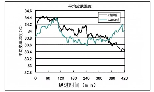 攝取GABA組和對(duì)照組在睡眠的初期皮膚溫度都有所上升。但是科學(xué)家們確認(rèn)了攝取GABA組在入睡時(shí)隨著時(shí)間推移皮膚溫度下降,而且接近起床時(shí)間時(shí)皮膚溫度回升。