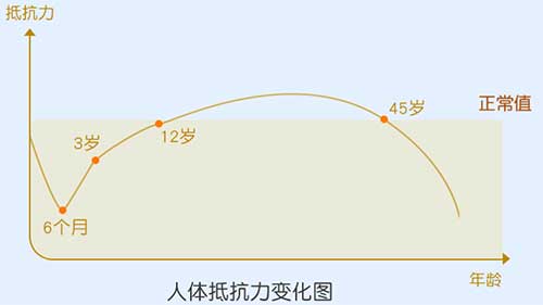 可以看出,嬰幼兒的抵抗力隨著時間的推移劃出了一條彎曲的弧線,自出生到6月這段時間,抵抗力不斷降低,6個月后才開始逐漸攀升。